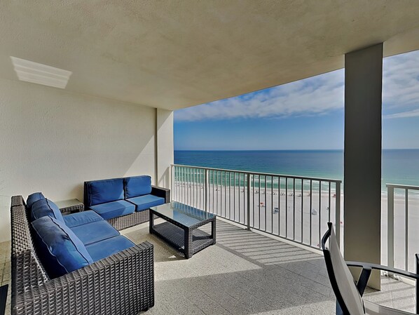The private balcony is the perfect spot to relax with a morning coffee or evening sunset, with sweeping views of the Gulf. The condo also includes a full-size washer and dryer for your convenience.