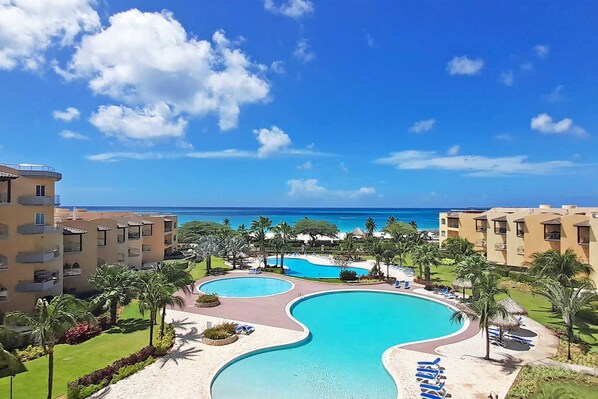 Perfect location across from Eagle Beach. Clean, secure and quiet location. Fantastic view from our room/ deck of pool, ocean and sunsets each night. Was able to walk to several good restaurants. Ocean and beach was very clean. Cant wait to come back. Several pools to choose from at this location.