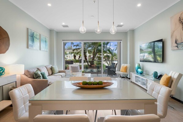 Der offene Wohnbereich ist mit einem großen TV, einem Schlafsofa (mit doppelter Matratze), einem Esstisch für 6 Personen und einer voll ausgestatteten modernen voll ausgestatteten Küche mit 4 Barhockern ausgestattet. Der Eingangskorridor bietet Zugang zu einem halben Badezimmer. Es gibt auch eine Waschmaschine und einen Trockner zur Verfügung.