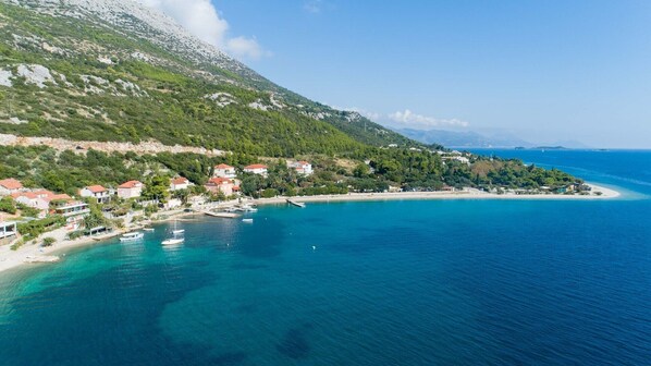 Lucy Apartments are located first row to the sea in the peaceful village of Kućište, just across the channel from the island of Korčula. The house offers 6 comfortable apartments equipped for your pleasant summer vacation. The first beach is right in front of the house and several more beautiful beaches are a few minutes walk away, left or right of the apartment. Kućište is known for its ideal conditions for sea sports, especially windsurfing. This is made possible by the pleasant mistral wind that blows almost every day in the afternoon. The house also has a good restaurant where all meals are served, including breakfast. On the beach, right in front of the house, the owners have their own private windsurfing school, where you or your children can take lessons or just rent equipment. There is also a storage room where you can leave your private equipment. In the sea in front of the house there are several buoys where you can tie up your boat.