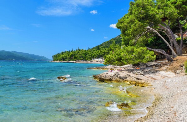 Einkauf 200 m, Restaurant 200 m, Ortszentrum 1100 m. Flughafen in Dubrovik 125 km. Orebić: Bank 1000 m, Arzt 1100 m und Apotheke 700 m. Im Sommer: Adriatisches Meer 50 m in Orebić (Strand 100 m in Orebić mit Sand, Kies, Steinen, Felsen und Badeplateaus). Orebić: Hundestrand, Tauchen, Bootsverleih jeweils 100 m. Wassersportmöglichkeiten 150 m.