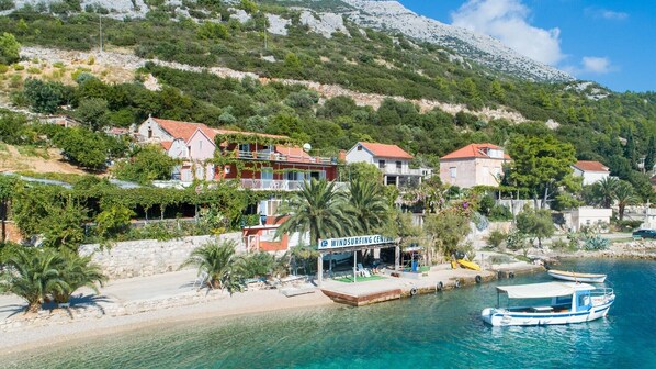 Lucy Apartments are located first row to the sea in the peaceful village of Kućište, just across the channel from the island of Korčula. The house offers 6 comfortable apartments equipped for your pleasant summer vacation. The first beach is right in front of the house and several more beautiful beaches are a few minutes walk away, left or right of the apartment. Kućište is known for its ideal conditions for sea sports, especially windsurfing. This is made possible by the pleasant mistral wind that blows almost every day in the afternoon. The house also has a good restaurant where all meals are served, including breakfast. On the beach, right in front of the house, the owners have their own private windsurfing school, where you or your children can take lessons or just rent equipment. There is also a storage room where you can leave your private equipment. In the sea in front of the house there are several buoys where you can tie up your boat.