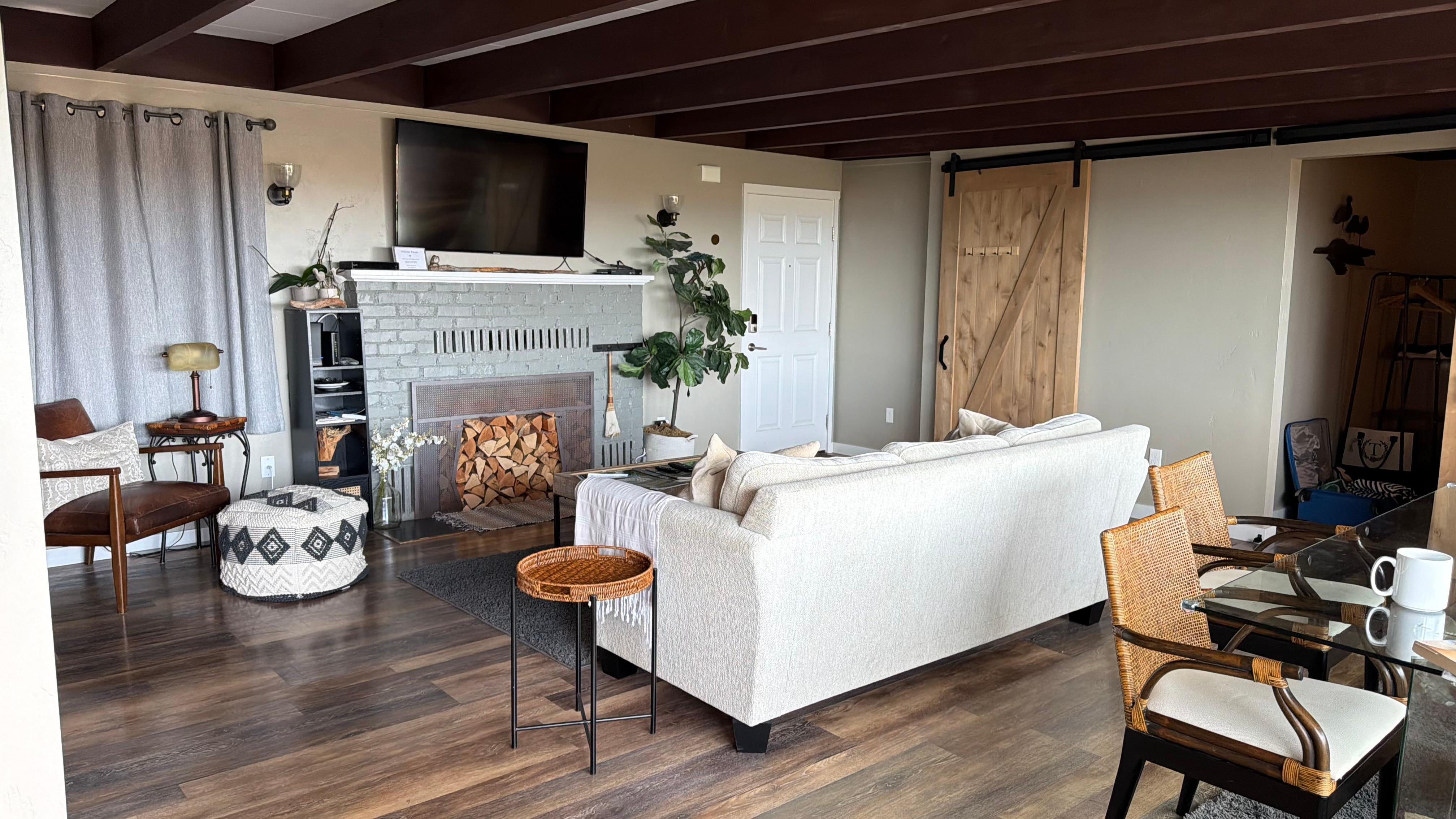 Wohnzimmer hat neues Sofa mit Verfolgungsjagdaufenthaltsraum und einem stattlichen ledernen Lesestuhl. Sowohl im Wohn- als auch im Esszimmer befindet sich ein großer 55-Zoll-Fernseher.