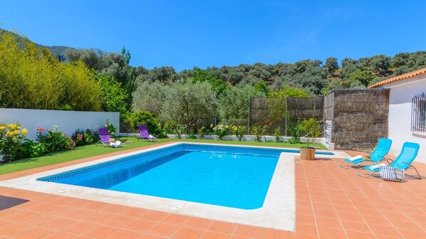 Der Außenbereich ist ein ausgezeichneter Ort, um die Sonne und die warmen Sommernächte zu genießen. Es gibt einen grossen privaten Pool mit zahlreichend Liegestühlen, einen überdachten Essbereich, sowie einen überdachten Grill. An der Vorderseite der Villa gibt es ausserdem eine große überdachte Veranda.