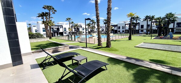 It has garden furniture, 15 m² terrace, washing machine, internet access (wifi), central heating, air conditioning, communal+children's swimming pool, 1 Television.