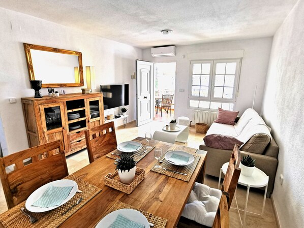 Hervorragende Wohnung, die 2021 renoviert wurde, in einer schicken, grünen und ruhigen Gegend des Golfplatzes Las Ramblas mit 2 Schlafzimmern (1 Bett 180cmx200cm und 2 Betten 90cmx190cm), 3 Klimaanlagen, Zentralheizung (ideal im Winter), 2 Bädern, 2 Terrassen und einem kleinen Garten. Das Meer, Geschäfte, Restaurants und 5 Golfplätze sind ganz in der Nähe.