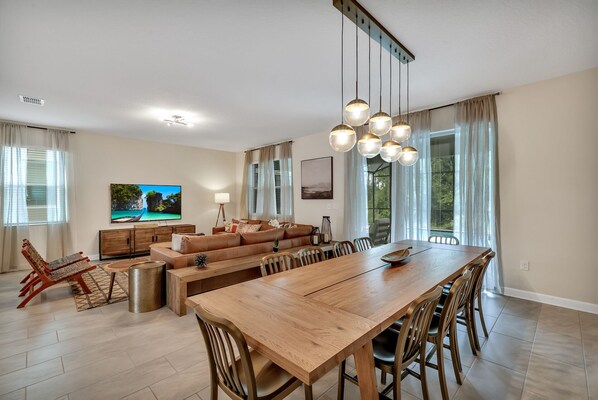 This house was great for our group - HUGE! We were only 6 people, but each wanted our own room and bathroom and this was perfect for that. Four single adults and one couple, and each had our own king bed and full bathroom, with two rooms to spare! Good spaces for hanging as a group and the pool was great too. We also went to the lazy river and bigger pool in the neighborhood and enjoyed that too. Had a slight hiccup with the door code, but it was solved very quickly. The only area for improvement would be clearer directions for the gates into the neighborhood - we never encountered one guarded by a human, and the instructions with the QR code could’ve been described more clearly. But we figured it out! We were close enough to universal and also to the wedding we were attending at Disney's swan reserve. Great weekend and we would stay again!