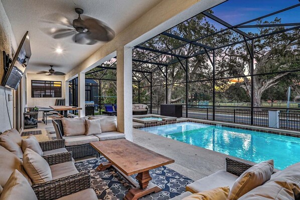 Large 30’ long pool with waterfall hot tub. No neighbors behind—backs to a beautiful park. Very private.