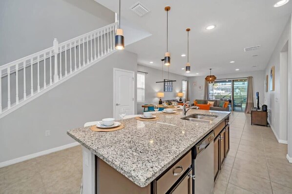 Just steps from the Windsor at Westside clubhouse, this home lifts your spirits with its colorful, modern, elegance and delightful themed bedrooms! The minute you step inside, you'll feel the vacation mood. Relax by your private pool and spa ,or head upstairs to the Star Wars themed entertainment area which features foosball, shuffleboard and an oversized movie screen! This luxurious and spacious 6 bedroom/4.5 bathroom vacation home offers the perfect retreat to gather with family and friends. Featuring colorful and modern themed rooms including Princess, Star Wars and Cars, your kids will love the iconic characters. Sleeping up to 13 guests, the home also has a private pool/spa, and a modern kitchen with stainless steel appliances.