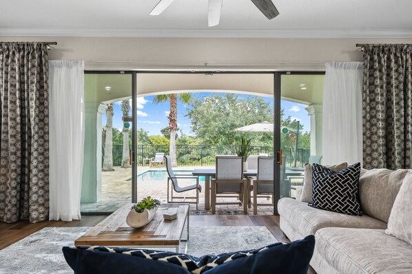 The living room opens up with a breathtaking panoramic view of the private extended patio area with a private heated pool and spillover spa. The owners of this home have really taken advantage of every square inch of land by extending the back patio, to allow guests to stretch out and soak up the Florida sun on all sides of the pool. Guests will be able to do so on the multiple lounge chairs laid out for their enjoyment for those looking to grill up their favorite meal. A built-in outdoor gas grill is perfect for a nice weather meal and covered outdoor dining for six is a great place to sit outside and enjoy, an outdoor ceiling fan is also sure to keep the air nice and comfortable on warm Florida days. Guests will enjoy sweeping fairway views of the renowned Jack Nicholas course from the back patio.