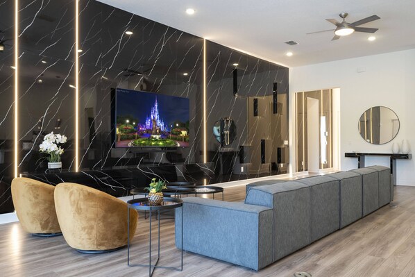 loft/game room with a pool table and karaoke set-up, and a home theater