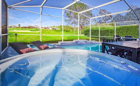 pool with a hot tub, sun loungers and an alfresco dining area. This