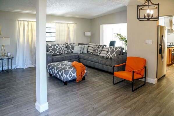Welcome to this charming home in Orlando, FL. This lovely property features 3 cozy bedrooms with a king, a queen, and 2 full beds. The living room offers an additional space with a comfy sofa bed for extra guests. With amenities like a washing machine, dryer, central AC, heating, and WiFi; our guests can relax and unwind in this beautiful vacation home. Our place will help you feel at home while you're traveling in Orlando. Perfectly located in the heart of central Florida. 8 minutes from Orlando international airport, 15 from downtown Orlando/Universal studios/Sea world, and 30 minutes from Disney world. The home is located in a quiet family friendly neighborhood surrounded by plenty of fast food, dine in restaurants, theme parks and lots of entertainment. Enjoy free private parking. 3 bedrooms 2 bathrooms. Please enjoy our free wifi during your stay. Smart tv in living room, smart tv in master bedroom. Private covered outdoor grilling/lounging area with a tv and fire stick. We welcome up to 2 dogs with a pet fee, no cats or other pets. Outside camera surveillance mandatory for your safety. There is a large pool on the property and it is not offered as a part of the listing as it is kept covered. Just put in your own streaming password. The pool is an extra amenity that is not advertised with the home. Please DO NOT park on the grass. The private parking can park 4 vehicles.