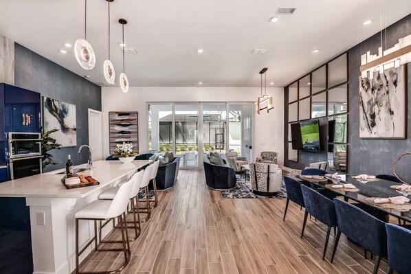 POOL & PATIO: Step outside to take a refreshing dip in your private, screened pool, or challenge the gang to a game of foosball. Unwind in the spillover spa, or stretch out on a lounger with a good book. Why not eat poolside too? The covered outdoor kitchen with a built-in grill* has its own dining area and is just the spot to whip up some Florida BBQ.