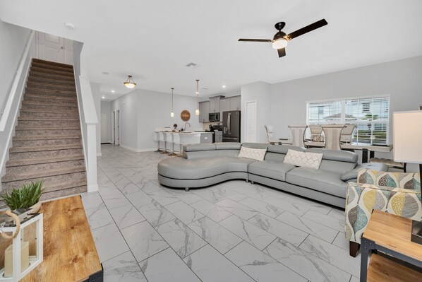 Inside, enjoy a fully equipped kitchen with granite countertops, stainless steel appliances, and a breakfast island with seating, along with a formal dining area for memorable family meals. The spacious living areas provide comfort and relaxation after a fun-filled day exploring Orlando’s world-famous theme parks.