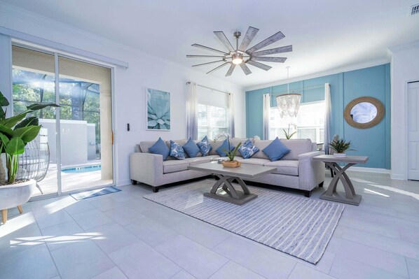Outside, the private patio opens to the tranquil allure of Florida’s sunshine. Take a leisurely dip in the private pool, or lounge surrounded by the estate's tropical beauty. The villa is more than just a place to stay; it's an experience of luxury, comfort, and unforgettable memories.