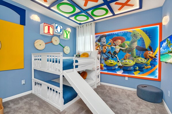 * 15 bedrooms * 11 bathrooms * Sleeps 38 guests * Open-plan living and dining area * Fully-equipped kitchen * Themed games room * Private screened-in pool * Alfresco dining and lounge areas * Themed bedrooms * Access to resort amenities * Gated community (24-hour security)