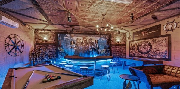 Considering we booked the house for our family consisting mostly of children, the state of the game room/games was a huge disappointment. Every game had an issue and the 'Guest Experience Team' (Laura) with Top Villas was useless considering we only asked them to fix the arcade game that wouldn't turn on. They never showed up to TRY to fix it. The game room was falling apart with hanging ceiling tiles, ripped wall paper, and damaged bar and lights. The air hockey table would not float the puck. The felt on the pool table was damaged. The Foosball table had missing score counter and scored balls dropped to the floor. The kitchen had lots of excessively used cookware and zero serving dishes. There was one bathroom that looked like it had a badly cleaned poop party. The rooms on the other hand were clean and nicely decorated but had broken drawers, stained dressors, and missing/broken decorations. The houses were so close together that the pool did not feel private and the neighbors were very loud. The resort amenities were very nice but you had to pay extra for the majority of the daily activities.