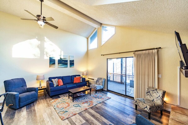Indoors, soaring ceilings and abundant windows create grand spaces illuminated with natural light. The living room offers plush sofa and armchair seating with a smart TV, so even while away you’ll never miss an episode of your favorite show. The galley kitchen showcases stainless steel appliances and striking blue cabinetry, fully equipped with all the comforts of home. Enjoy casual bites seated up at the counter on the high-top barstools for 5 or take your meals together in the formal dining room with an elegant table seating 8. Get your morning started off right with a fresh cup of coffee brewed on the drip or Keurig coffee makers, enjoying those first few sips out on the balcony taking in the fresh Ozark air and planning another day filled with adventure.