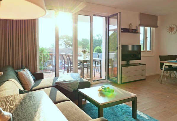 Die helle 2-Zimmer-Wohnung für 3 - 4 Personen mit Balkon (mit Meerblick) und eigener Sauna ist modern und hochwertig eingerichtet und liegt im ersten Obergeschoss. Ein Tiefgaragenstellplatz ist vorhanden.