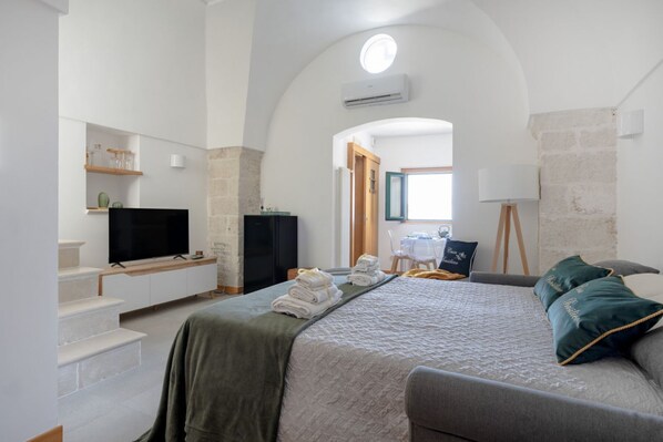 Comfortable apartment for 2 people, located on the 1st floor of a house without a lift (steps to access) in the heart of Ostuni, in a small street in the historic center (ZTL). It offers everything you need in an optimized space and in a welcoming environment. Perfect for those who want to immerse themselves in the unique atmosphere of the White City, the accommodation is located just 250 meters from the Cathedral, allowing you to easily explore all the main points of interest on foot.