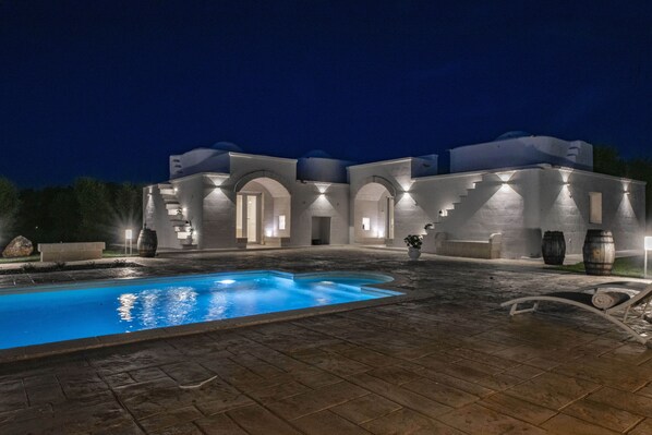 Outside where the splendid swimming pool dominates, there is a vast solarium with chaises longues and stone seats in pure local style and a vast area dedicated to the outdoor kitchen with a shaded patio for dinners and lunches by the pool.