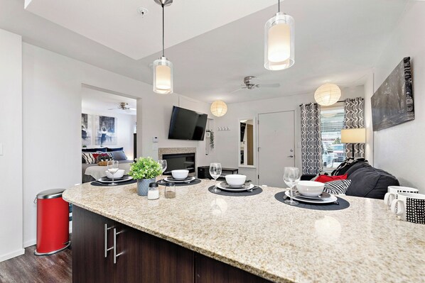 ❂Fully stocked kitchen with Coffee Maker, Tea Kettle, Tea, Brita Filter, Wine bottle opener, Pots and pans, Cooking utensils, Flatware, and Drinking glasses.