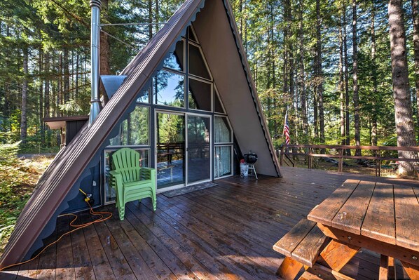 Buchen Sie Ihren Skiausflug zum White Pass und übernachten Sie im "Alpine Annie's", einer authentischen Ferienhütte mit 1 Schlafzimmer und 1 Bad, nur 30 Minuten vom Skigebiet entfernt. Dieser gemütliche A-Rahmen bietet ausreichend Platz für 4 Personen und bietet alles Nötige, darunter ein robustes Dekor für die Wildnis, einen Gaskamin, einfachen Zugang zum Erholungsgebiet und eine riesige Terrasse mit Blick auf den Wald. Ob Sie in der Stadt sind, um den Berg zu besteigen. Egal, ob Sie im White Pass Resort regnen oder Ski fahren - in Washington fühlen Sie sich wie zu Hause!