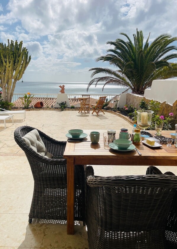 Lassen Sie sich vom Sonnenaufgang und dem Meeresrauschen langsam in den Tag begleiten. Danach einen Kaffee mit frischen Panecillos vom Bäcker auf der windgeschützten Terrasse. Selbstgepresseter Orangensaft dazu? Ungestörter Blick in den Garten, auf die Sonnenterrasse und die Meereswellen. Die große helle Markise hält vorwitzige Sonnenstrahlen fern.