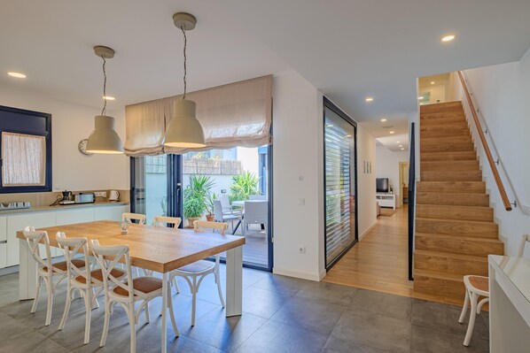 Im Erdgeschoss befindet sich ein elegantes Wohn- und Esszimmer mit direktem Zugang zu einer angenehmen Terrasse – ideal für Mahlzeiten im Freien. Die Küche ist geräumig und vollständig ausgestattet. Auf dieser Etage gibt es außerdem ein Doppelschlafzimmer mit Doppelbett sowie ein komplettes Badezimmer mit Dusche.
