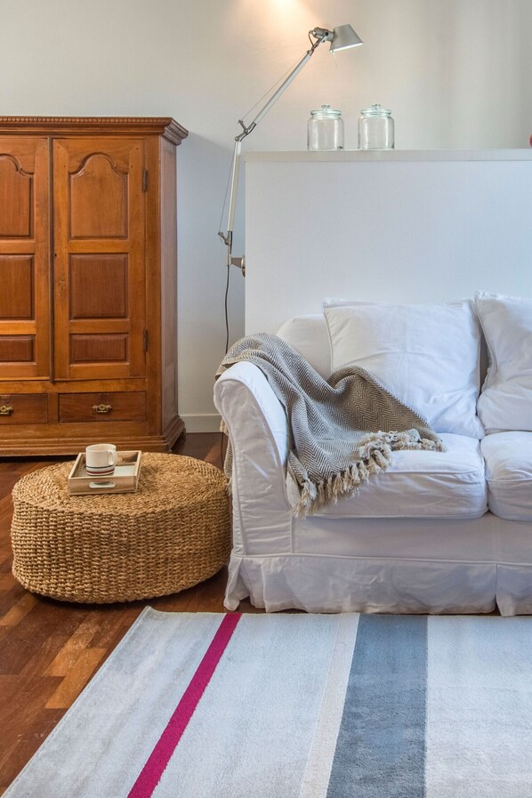 The living room is furnished with a sofa, bookshelf, and a dining table with chairs, separated from the kitchenette by an elegant wall.