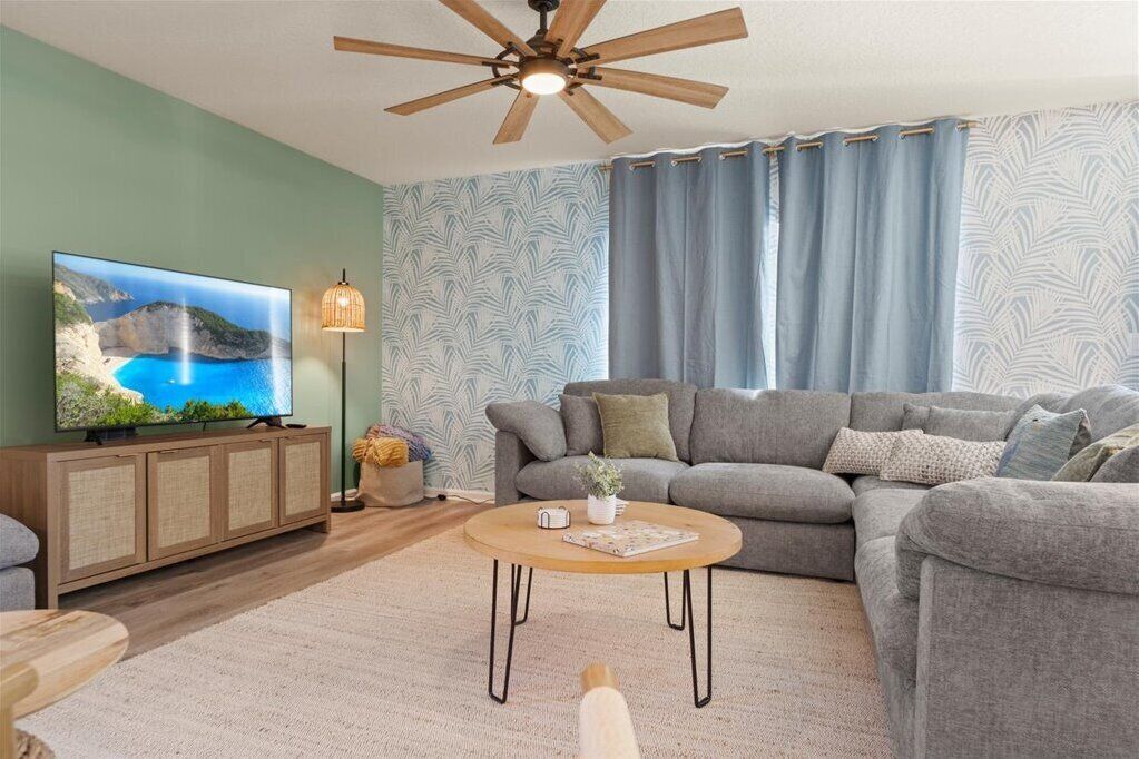 Living Room: Relax in the spacious living room featuring a 70" TV, perfect for movie nights or catching up on your favorite shows.