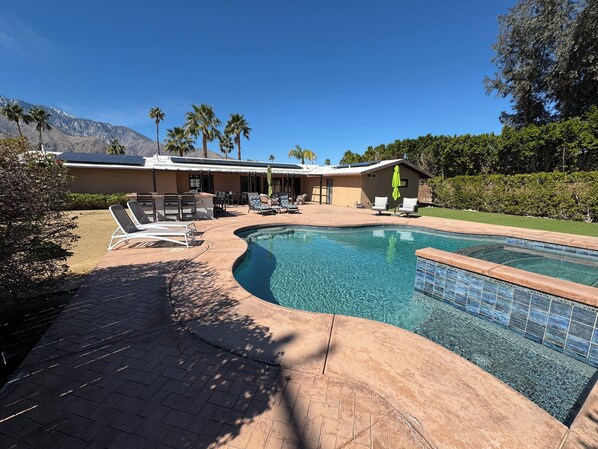Welcome to this spacious home in Palm Springs with amazing mountain vistas! Located close to the center of town and all top attractions, this mid-century home has three bedrooms with one king bed and two queen beds and two full bathrooms. This charming property is perfect for a soothing getaway for families and friends. Enjoy the multiple amenities including a heated pool and hot tub, a very spacious back yard, and a two car garage. Fall in love with Palm Springs from this home away from home!