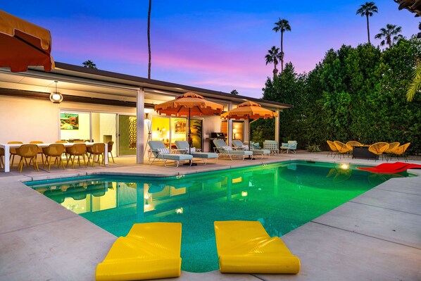 The Sunset Suite With its warm orange hues inspired by the desert sunsets, this primary bedroom gives you direct pool access and sunset views in the afternoon. Its wooden furniture and breeze block wallpaper bring the retro feel to the fore. This oversized bedroom with high vaulted ceiling features a luxuriously soft, hotel quality king-size bed, Brooklinen linens, its own private en-suite bathroom, large walk-in closet space, and generous dresser with large television. The primary en-suite bathroom is also mid-century in style with its white and wood twin vanities, retro lighting, and brightly tiled shower.