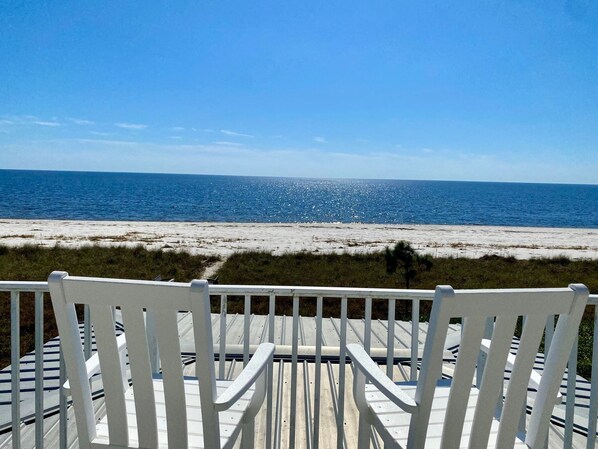 Betrachten Sie das wunderschöne Wasser des Golfs von Mexiko von den Veranden im Erdgeschoss oder vom geräumigen Hauptschlafzimmer im Obergeschoss, das sich zu einer privaten Terrasse mit einem weiten Blick auf die weißen Sandstrände öffnet. Die Terrasse bietet Privatsphäre und einen freien Blick, den Sie nie vergessen werden.