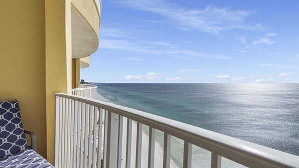 Diese echte Penthouse-Einheit auf der Insel Emerald Isle liegt am westlichen Ende, um den besten Blick auf den Sonnenuntergang von Panama City Beach zu gewährleisten. Schauen Sie nach links und sehen Sie den Anlegesteg des Piers und in der Ferne den ersten Anlegesteg, an dem an Wochenenden und Feiertagen alle Feuerwerkskörper ausgehen. Sie sind vorne und in der Mitte, wenn Leute Feuerwerk am Strand schießen, manchmal das Gefühl, als könnte man sie erreichen und berühren. Wir haben geräumige, abgerundete Balkone, die einen besseren Blick auf das schöne smaragdgrüne Wasser ermöglichen.