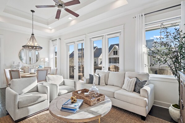 Designed with attention to detail, this beach house features 9-foot ceilings and a wall of windows that fill the living area with light. The living room has brand-new furniture for ultimate comfort. The split-bedroom layout ensures privacy: