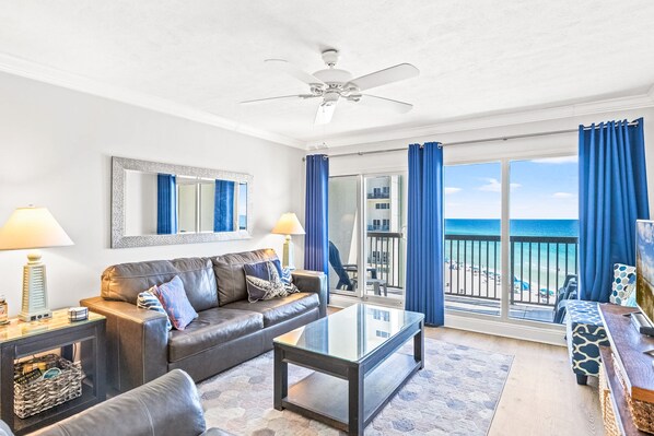 The condo was great and the views were perfect! We really enjoyed ourselves and would love to come back! There was a few kitchen issues and I have provided photos. The kitchen could have used a few items such as a baking/cookie sheet and a scissors. Perhaps a few ice cube trays since the ice maker doesn't work. And everyday the ice machine down in the parking lot was always empty. Also when we were making bacon on the stove because there was no cookie sheet to cook in the oven the smoke alarm went off and when I turned on the vent on the microwave the air blew the vent cover off and it landed on the frying pan full of bacon grease and luckily most of it miraculously stayed on the stove and only splattered me with hot grease. It could have been sooo much worse but the vent had no screws or anything to hold it on so I placed it on top of the fridge. Obviously this is dangerous and needs repair. And the other issue that was disappointing is that the fridge froze all our food. I even turned the temp down after the first day and the veggies and such were frozen and turned mushy. And even frozen beer and butter. And lastly the towel situation was not great... very old and gross stains that as an owner I would be embarrassed to put out for my guests. Some hand soap in the bathroom would have been nice too. Someone had put a hand soap in the kitchen we took in there but it was filled with just water. Again nothing that really affected our fun just details for you.