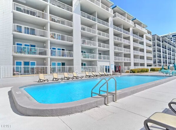 Amenities include: large pool with LED lights for nighttime swimming, pool deck furniture, cookout area with gas grills, and a private fenced in deck overlooking the Gulf. There is an outdoor shower at the gate/deck leading to the sand. Other amenities include tennis courts, owner's lounge, game room, and shuffleboard courts.