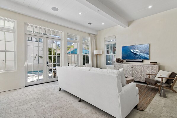 Entrance to the home's foyer showcases Venetian plaster walls and white travertine stone floors, as well as entryway seating and coat storage. The main level offers incredible gathering spaces - seating at the banquet table for ten, with an additional five dining stools along the kitchen's breakfast bar. The 1st floor living room area is configured with a sofa, two chairs, and a large smart TV. The living/dining area opens out into the home's private courtyard. Along with the home's heated* pool, this outdoor haven comes furnished with lounge chairs and al fresco dining accompanied by the outdoor fireplace.