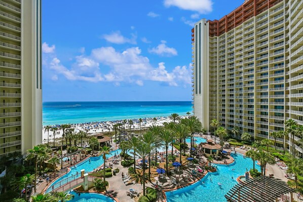The living room offers a comfy family space plus a pull-out sleeper sofa if required. If you need to do some laundry while you are here there is a washer/dryer for your convenience. A private parking space is included on the same floor as the condo - during busy times of the year, this is a HUGE bonus! Resort amenities at Shores of Panama are the best on Panama City Beach! From the pool, you are just steps to the sand with a private beach access. You may not want to leave the spectacular lagoon-style pool area – during the spring and summer months, guests can purchase cocktails from the Tiki Bar, a variety of food and snacks from the poolside cafe, and snow cones from the pool deck. For the cooler months, there is a heated indoor pool, indoor and outdoor hot tubs, and a state-of-the-art fitness center.