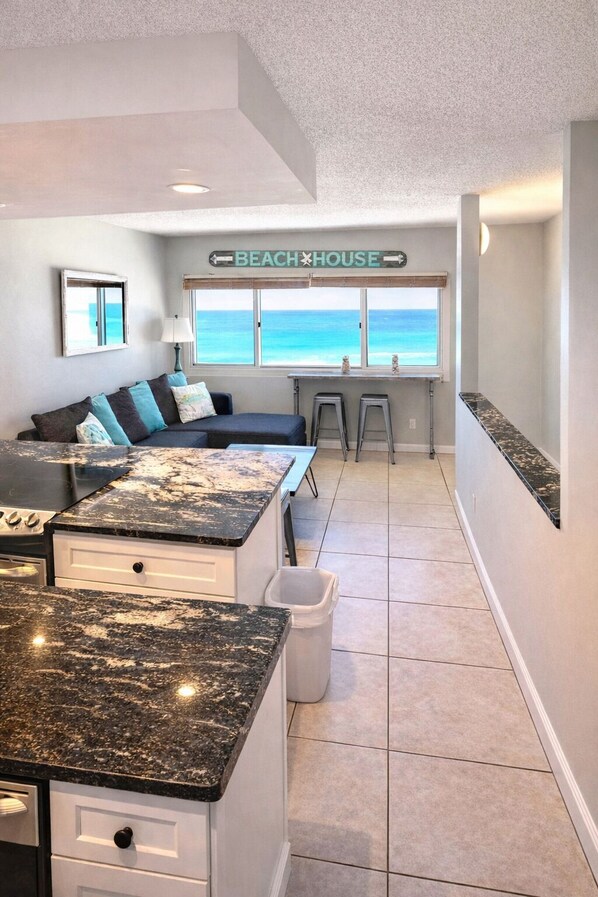 Unsere Wohnung wurde komplett renoviert. Wir haben einen neuen 50 "Smart-TV im Wohnzimmer, eine brandneue Küche und Geräte. Die Matratzen und Betten sind brandneu. Das ist Luxus vom Feinsten. Toller Blick vom Balkon auf den Sonnenaufgang und toller Blick auf die Sonnenuntergänge vom Wohnzimmer und vom Schlafzimmer im Erdgeschoss. Pinnacle Port ist ein wahrhaft altes Florida.