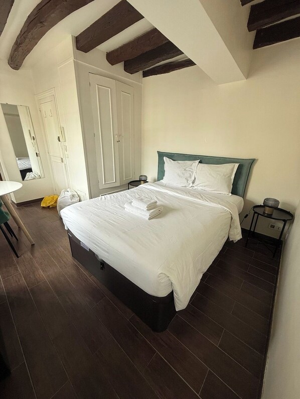 The sleeping area faces the street and features a double bed with a high-quality, comfortable mattress. Professionally laundered sheets, pillows, and towels are provided for each guest. The bathroom, accessed via the hallway, includes a shower, toilet, and sink, with complimentary toiletries to start your stay, including a hairdryer, toilet rolls, shampoo, shower gel, and hand soap.
