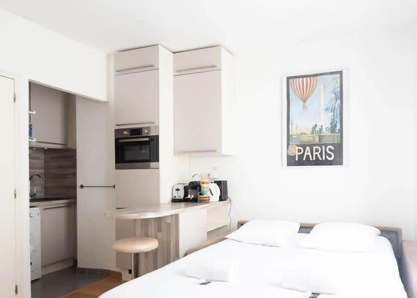Located in a pleasant building, this well-designed apartment offers all the comfort you need. It features a living area with a sofa bed, a bedroom with a double bed, a shower room, and a fully equipped kitchen.