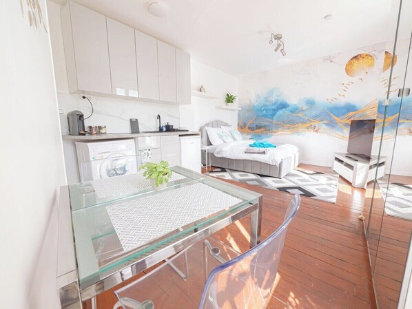 Modern comfort: enjoy your stay in a flat situated on second floor without lift, in a cleverly designed space. Relax in front of the Smart TV after a day of exploring, surf the web with ease thanks to the fibre-optic Internet connection, and enjoy a delicious freshly ground coffee from the Nespresso machine at your disposal.