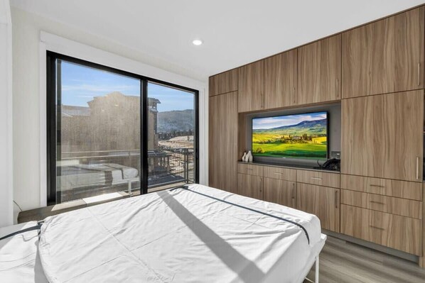 Head further into the room and take in the cozy living space that features a comfortable oversized Italian couch perfect for snuggling up on as you enjoy a movie on the 55” TV. This bright space includes a large mirror, a coffee table, and built-in shelving for additional storage space. From the living room open the large sliding glass patio door and enjoy the step-out balcony where you can take in views over the Canyons Resort base area.