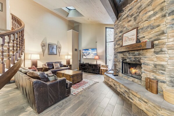 Upon entry, be captivated by the vast living space featuring vaulted ceilings, an abundance of windows, and multiple skylights. The focal point, a wood-burning fireplace framed by a towering stone hearth, sets the tone for the main seating area, complemented by a sweeping staircase. Additional highlights include a generous eight-person dining table, a dedicated reading nook with a chess table, and a fully-equipped kitchen with stainless steel appliances. The main floor also hosts a bedroom with a queen bed and a full bathroom. In addition, there's a queen Murphy bed in the living area for more sleeping options.