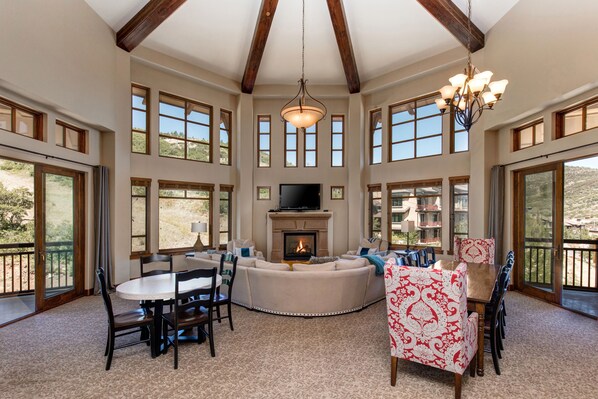 A warm welcome awaits you at Abode at Alpine Penthouse. Make an entrance into your private penthouse unit and be wowed by the double-height great room with floor-to-ceiling windows. Gather round the grand hearth fireplace on surrounding plush seating and recount memories new and old, catch up on your favorite shows in front of the flat screen TV or place your bets on a game of poker at the game table with a cocktail from the wet bar and the Wasatch Mountains as your backdrop. When your adventure-hungry group has worked up an appetite, the fully equipped gourmet kitchen has everything you need to whip up delicious meals and dine in style at the dining table with seating for 10, or spread out to the four-seat breakfast bar or either of your private balconies set just off the kitchen & living areas.