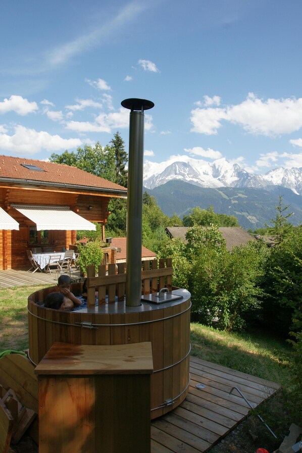 Für Liebhaber ruhiger Orte und großer Freiflächen wird Sie unsere nordische Blockhütte mit ihrer dominierenden Lage auf 1000 Metern über dem Meeresspiegel mit Blick auf den Mont Blanc, eingebettet in üppiges Grün, verführen. Das Interieur ist gemütlich, im Berggeist eingerichtet und bietet allen gewünschten Komfort (Holzofen, Fußbodenheizung, komplette Ausstattung und Qualität). Eine geräumige, gut ausgestattete Küche öffnet sich zum Wohnzimmer. Eine große überdachte Terrasse und zwei Balkone ermöglichen es Ihnen, das außergewöhnliche Panorama zu genießen. Im Obergeschoss erwarten Sie 3 gemütliche Zimmer. Das Groundhog-Zimmer verfügt über ein Etagenbett und ein Einzelbett. Das Zimmer Deer ist das Hauptschlafzimmer und bietet Blick auf ein kleines Auf dem Balkon des Mufflons gibt es auch ein Etagenbett mit einem Schubladenbett und Blick auf den Balkon. Im Erdgeschoss finden Sie eine große Garage mit einem Waschraum mit Waschmaschine und Trockner. Schließlich beherbergt der Garten ein nordisches Bad für 6/8 Personen, die mit Strom oder Holz arbeiten und über ein Bromfiltersystem verfügen. Sie werden die Aussicht auf den Mont Blanc vom Bad aus zu schätzen wissen, wo es sich lohnt, nach einer Wanderung vom Chalet aus (Zuflucht von Varan, Ayère, Pormenaz-See) zu entspannen. Murmeltiere sind keine Seltenheit! Das Bad ist zum Zeitpunkt der Buchung extra. Bitte korrigieren Sie das Angebot.
