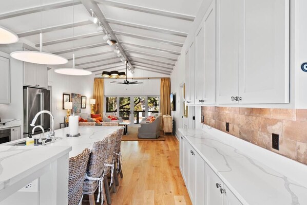 The house is lovely and the kitchen is well stocked. We LOVED the porch! There were lots of nice touches like the ice maker, 2 laundry rooms, basketball hoop, and plenty of showers. The neighborhood is so cozy and the beach is a short walk away to the access. We have been coming many years to Litchfield and this rental was top notch.